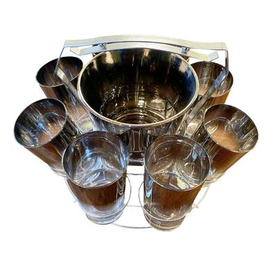 Serve up some fun with this retro Dorothy Thorpe eight glasses set with silver trim and a matching ice bucket in a convenient ready to carry round caddy.