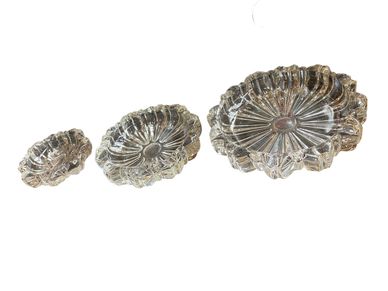 A set of three glass ashtrays. Appear as a nest when stacked.