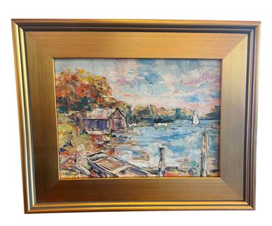 A peaceful yet colorful mid century painting of sailboats near the boathouse. In a dark wood frame.