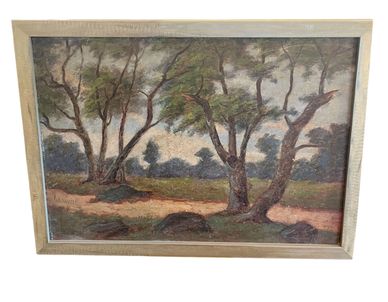 Delicate brushwork and a gentle, earthy palette lend the piece a timeless elegance, while the original giltwood frame adds a warm, antique glow. The painting is full of depth and movement, drawing the viewer into a tranquil, dreamlike countryside.